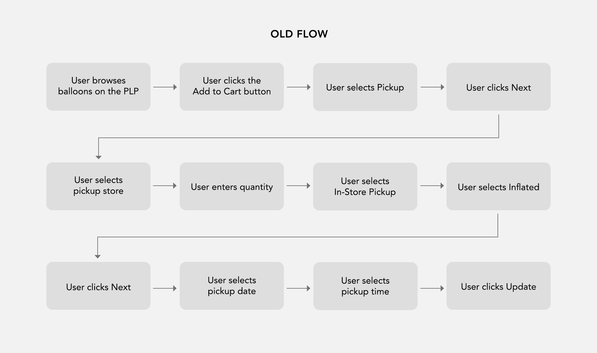After thorough investigation, we discovered that the balloon purchasing process was lengthy and convoluted, involving high click-effort and repetitive steps to add helium inflation for each balloon in the cart. Additionally, customers didn’t know how many balloons could fit in a vehicle, how long they could float, or how to keep them from popping. This resulted in long shopping sessions, frustration at point-of-pickup, and customer complaints in our product reviews and across social media.