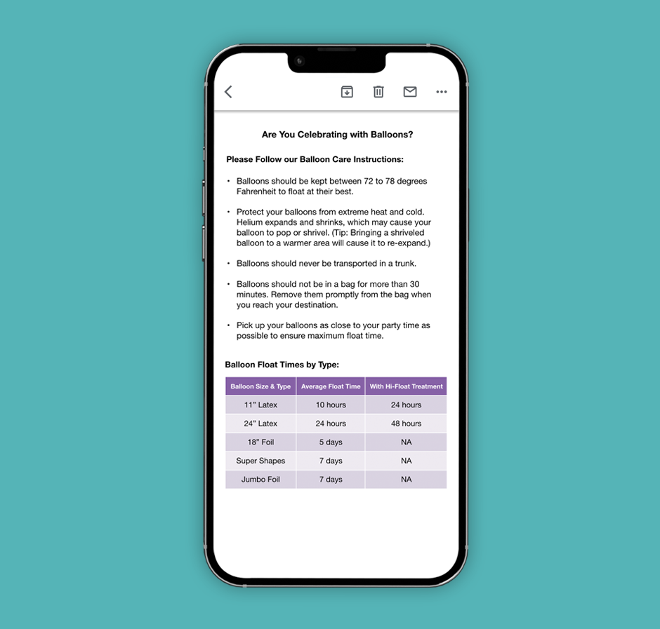 We decided to add balloon care tips to the order confirmation and pickup notification email to remind users to protect their balloons during transit and at their party. We also included troubleshooting and safety information to help users if they experienced problems.